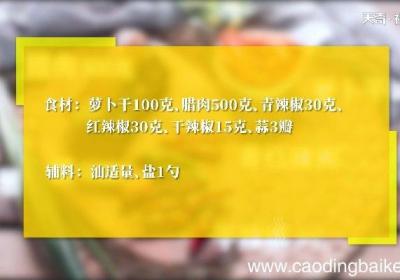 发布时间: 13小时前【萝卜干炒腊肉怎么做 萝卜干炒腊肉的做法】步骤1食材:萝卜干100克、腊肉500克、青辣椒30克、红辣椒30克、干辣椒15克、蒜3瓣、油适量、盐1勺 。步骤2红辣椒切圈 。步骤3青辣椒切圈 。步骤4腊肉放入沸水中焯水,煮20分钟后,捞出切薄...