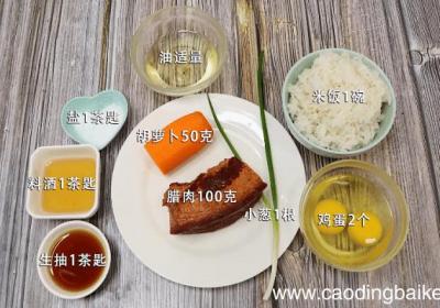 发布时间: 13小时前步骤1准备食材:腊肉100克、米饭1碗、鸡蛋2个、小葱1根、胡萝卜50克、盐1茶匙、料酒1茶匙、生抽1茶匙 。步骤2腊肉切丁 。步骤3胡萝卜切丁 。步骤4小葱切葱花 。步骤5鸡蛋搅散备用 。步骤6首先碗中倒入米饭,倒入一半蛋液,搅拌均匀 。...
