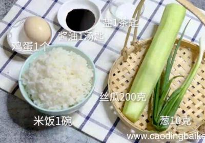 发布时间: 9小时前步骤1主料:米饭1碗、丝瓜200克 。辅料:鸡蛋1个、葱10克、酱油1汤匙、盐1茶匙 。步骤2丝瓜滚刀切成小块 。步骤3葱切成葱花 。步骤4将鸡蛋打入碗中打散,下炒锅炒熟盛出来备用 。步骤5用少量葱花炝锅,再放入丝瓜、盐、酱油,将丝瓜炒熟...