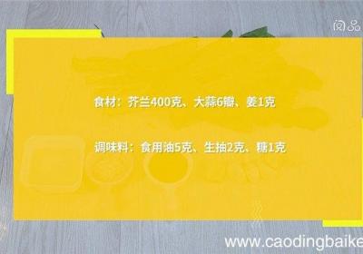 发布时间: 16小时前步骤1食材:芥兰400克、大蒜6瓣、姜1克调味料:食用油5克、生抽2克、糖1克步骤2芥兰摘去叶子,洗净 。步骤3切片 。步骤4大蒜切末 。步骤5姜切末 。步骤6热锅倒油,油温5成热时,下蒜、姜,爆香 。步骤7倒入芥兰,翻炒至芥兰变软,调入生...