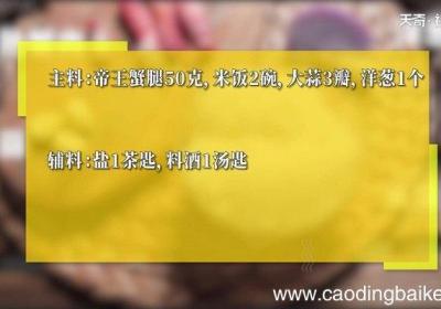 发布时间: 9小时前步骤1所需食材:帝王蟹腿50克,米饭2碗,大蒜3瓣,洋葱1个 。所需调料:盐1茶匙,料酒1汤匙 。步骤2熟蟹肉切丁 。步骤3洋葱切小块 。步骤4蒜切末 。步骤5炒锅热油,下蒜末、洋葱炒香 。步骤6再下蟹肉、米饭,翻炒5分钟 。步骤7加料酒、...