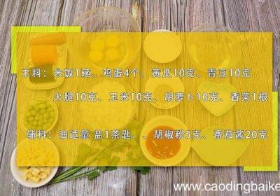 发布时间: 13小时前步骤1准备食材:米饭1碗、鸡蛋4个、黄瓜10克、青豆10克、火腿10克、玉米10克、胡萝卜10克、香菜1根、油适量、盐1茶匙、胡椒粉5克、番茄酱20克 。步骤2黄瓜切丁 。步骤3胡萝卜切丁 。步骤4火腿切丁 。步骤5香菜切末 。步骤6鸡蛋打...