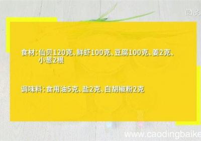 步骤1食材:仙贝120克、鲜虾100克、豆腐100克、姜2克、小葱2根调味料:食用油5克、盐2克、白胡椒粉2克步骤2仙贝加入料酒,拌匀,腌制10分钟 。步骤3鲜虾去虾头、虾线 。步骤4嫩豆腐切小块 。步骤5姜切末 。步骤6小葱切葱花 。步骤...