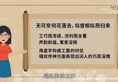 “无可奈何花落去,似曾相似燕归来”这两句都是描写春天,妙在对仗工整 。为天然奇偶句,此句工巧而浑成、流利而含蓄,声韵和谐,寓意深婉,用虚字构成工整的对仗、唱叹传神方面表现出词人的巧思深情 。花的凋落,春的消逝,时光的流逝,都是不可抗拒的自然...