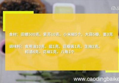 步骤1食材:田螺500克、紫苏10克、小米椒5个、大蒜5瓣、姜3克 。调味料:食用油10克、盐1克、豆瓣酱1克、生抽2克、料酒4克、花椒1克、八角1个 。步骤2田螺洗净,敲去螺尾 。步骤3小米椒切片 。步骤4大蒜对半切开 。步骤5姜切片 。...