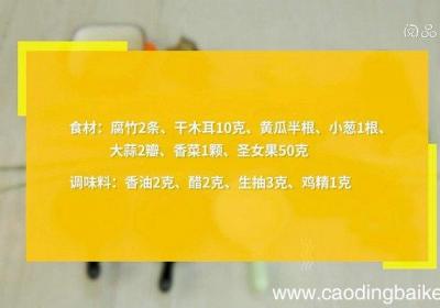 发布时间: 12小时前步骤1食材:腐竹2条、干木耳10克、黄瓜半根、小葱1根、大蒜2瓣、香菜1颗、圣女果50克、香油2克、醋2克、生抽3克、鸡精1克 。步骤2腐竹用清水泡软 。步骤3切段 。步骤4水沸后下锅煮2分钟,捞出,过凉水,沥干水分 。步骤5木耳用清水泡发...