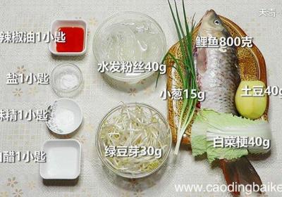 步骤1准备食材:鲤鱼800克、土豆40g、水发粉丝40g、白菜梗40g、绿豆芽30g、小葱15g、味精1小匙、盐1小匙、白醋1小匙、辣椒油1小匙 。步骤2鲤鱼去鳞,洗净后剔掉鱼骨,再去掉鱼皮,切成片,改刀切丝 。步骤3土豆切丝 。步骤4白菜...