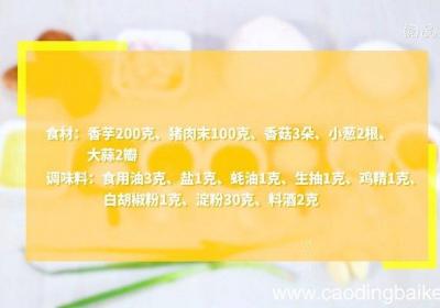 发布时间: 14小时前步骤1食材:香芋200克、猪肉末100克、香菇3朵、小葱2根、大蒜2瓣 。调味料:食用油3克、盐1克、蚝油1克、生抽1克、鸡精1克、白胡椒粉1克、淀粉30克、料酒2克 。步骤2香芋切小丁 。步骤3猪肉末加料酒,拌匀,腌制15分钟 。步骤4香...
