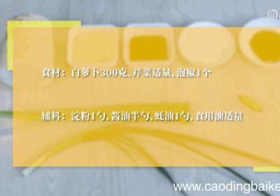 发布时间: 14小时前步骤1准备食材:白萝卜300克、小葱1根、芹菜适量,泡椒1个、油适量、淀粉1勺、酱油半勺、蚝油1勺 。步骤2白萝卜去皮,洗净,切成圆薄片 。步骤3将切好的白萝卜装入盘中备用 。步骤4芹菜切末 。步骤5泡椒切粒 。步骤6淀粉倒入碗中,加入水制...
