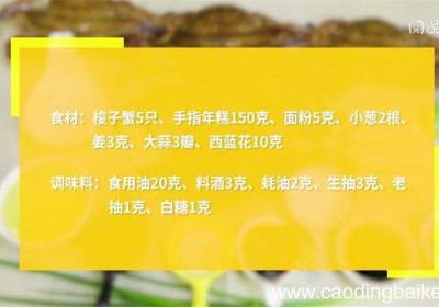 发布时间: 12小时前步骤1食材:梭子蟹5只、手指年糕150克、面粉5克、小葱2根、姜3克、大蒜3瓣、西蓝花10克、食用油20克、料酒3克、蚝油2克、生抽3克、老抽1克、白糖1克 。步骤2西蓝花掰成小朵,放入沸水锅中焯烫30秒,捞出备用 。步骤3梭子蟹对半切开,...