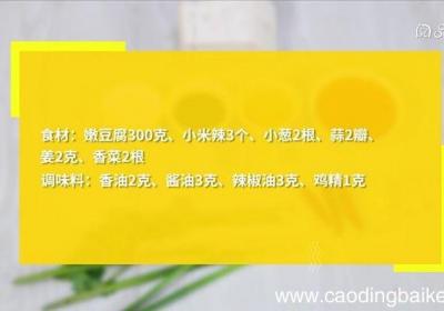 步骤1食材:嫩豆腐300克,小米辣3个,小葱2根,蒜2瓣,姜2克,香菜2根 。调味料:香油2克,酱油3克,辣椒油3克,鸡精1克 。步骤2嫩豆腐切片,用沸水浸泡10分钟,捞出装盘 。步骤3小米辣切末,蒜切末,姜切末,小葱切葱花,香菜切末 。【...