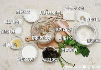 发布时间: 13小时前步骤1准备食材:扇贝200克、肥肉75克、珍珠菇50克、木耳丝30克、鸡蛋1个、淀粉2匙、鲜奶50克、香菜30克、姜葱水2匙、味精1匙、精盐1匙、胡椒粉1匙、香油1匙、清汤适量 。步骤2将香菜切末装盘备用 。步骤3将扇贝洗净,剁成细泥 。步...