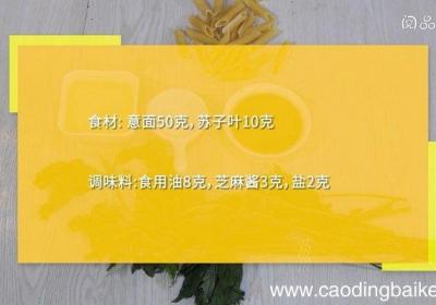 步骤1食材:意面50克,苏子叶10克 。调味料:食用油8克,芝麻酱3克,盐2克 。步骤2锅中水沸后,加1克盐、2克食用油、意面,煮8分钟,用手掐断意面,中间无白芯时,捞出过凉水,沥干备用 。步骤3苏子叶放入料理机,加10毫升清水,打成泥,调...