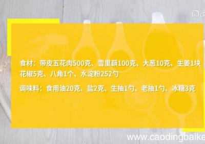 发布时间: 1天前步骤1食材:带皮五花肉500克、雪里蕻100克、大葱10克、生姜1块、花椒5克、八角1个、水淀粉2勺 。调味料:食用油20克、盐2克、生抽1勺、老抽1勺、冰糖3克 。步骤2雪里蕻先浸泡两个小时,中间换两次水清洗,去掉一部分盐分,捞出,挤去水...