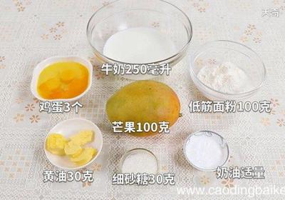 发布时间: 1天前步骤1准备食材:低筋面粉100克、黄油30克、牛奶250毫升、芒果100克、鸡蛋3个、奶油适量、细砂糖30克 。步骤2碗中加入鸡蛋,再倒入细砂糖,然后搅拌均匀 。步骤3蛋液里加入面粉,搅拌 。步骤4再加入融化好的黄油,加入牛奶,搅拌均匀,最...