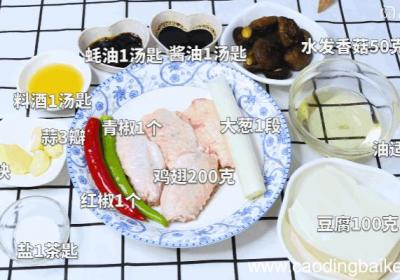 发布时间: 11小时前步骤1准备食材:鸡翅200克、水发香菇50克、豆腐100克、红椒1个、青椒1个、蒜3瓣、大葱1段、姜1块、酱油1汤匙、蚝油1汤匙、料酒1汤匙、盐1茶匙、油适量 。步骤2红椒切块 。步骤3青椒切块 。步骤4水发香菇切块 。步骤5姜切片 。步骤...