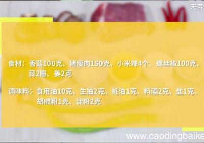 发布时间: 11小时前步骤1食材:香菇100克、猪瘦肉150克、小米辣4个、螺丝椒100克、蒜2瓣、姜2克 。调味料:食用油10克、生抽2克、蚝油1克、料酒2克、盐1克、胡椒粉1克、淀粉2克 。步骤2猪瘦肉切薄片、加入盐、料酒、淀粉、拌匀、腌制10分钟 。步骤3...