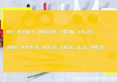 发布时间: 11小时前步骤1食材:柿子椒1个、香菇200克、大蒜2瓣、大葱10克调味料:食用油5克、蚝油1克、生抽1克、盐1克、鸡精1克步骤2柿子椒洗净、切小块步骤3香菇洗净、切小块步骤4大蒜切末步骤5大葱切片步骤6热锅倒油、油温5成热时、下葱、蒜、炒香步骤7放...