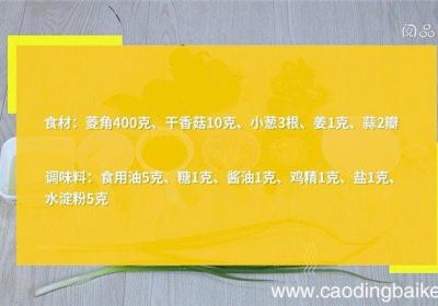 发布时间: 11小时前步骤1食材:菱角400克、干香菇10克、小葱3根、姜1克,蒜2瓣调味料:食用油5克、糖1克、酱油1克、鸡精1克、盐1克、水淀粉5克步骤2用刀将菱角对半切开,取出菱角肉,备用,干香菇用温水泡20分钟,捞出,泡香菇水留用 。步骤3小葱切断 。步...