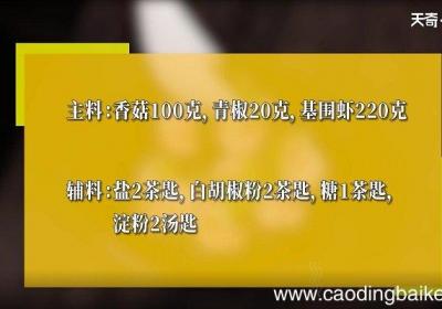 发布时间: 11小时前步骤1食材:香菇100克,青椒20克,基围虾220克 。调料:盐2茶匙,白胡椒粉2茶匙,糖1茶匙,淀粉2汤匙 。步骤2香菇去蒂 。步骤3青椒切粒 。步骤4虾仁开背,放入碗中,加胡椒粉、盐、食用油拌匀 。步骤5香菇入沸水,焯水2分钟,捞出待用...
