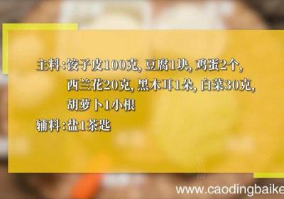 步骤1【四喜素蒸饺的做法 四喜素蒸饺怎么做】所需食材:饺子皮100克,豆腐1块,鸡蛋2个,西兰花20克,黑木耳1朵,白菜30克,胡萝卜1小根 。所需调料:盐1茶匙 。步骤2白菜切碎,加入盐腌制15分钟 。步骤3木耳切碎 。步骤4胡萝卜切丁...