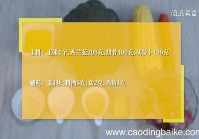 发布时间: 8小时前步骤1准备食材:玉米1个、西兰花200克、排骨100克、胡萝卜100克、姜1块、料酒5克、盐2克、鸡精1克 。步骤2玉米洗净切段,再对半切开 。步骤3西兰花切块 。步骤4胡萝卜切滚刀块 。步骤5姜切片 。步骤6锅中加入适量清水,放入排骨、料...