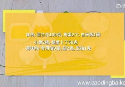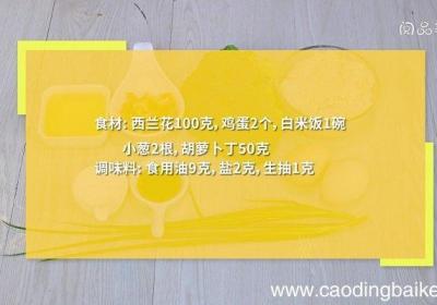 发布时间: 8小时前步骤1食材:西兰花100克,鸡蛋2个,白米饭1碗,小葱2根,胡萝卜丁50克 。调味料:食用油9克,盐2克,生抽1克 。【西兰花配蛋炒饭做法 西兰花配蛋炒饭怎么做】步骤2西兰花切小朵,用清水浸泡10分钟,捞出 。步骤3鸡蛋打散 。步骤4小葱切...