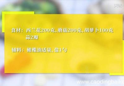发布时间: 8小时前步骤1食材:西兰花200克,蘑菇200克,胡萝卜100克,蒜2瓣 。辅料:橄榄油适量,盐1勺 。步骤2西兰花切成小块,加入清水洗干净 。步骤3蘑菇洗净切片 。步骤4胡萝卜切片 。步骤5蒜切末备用 。步骤6西兰花放入沸水中焯水3分钟,捞出沥干...