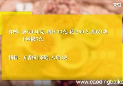 发布时间: 8小时前步骤1食材:蚕豆50克,豌豆30克,花生30克,桂皮1块,干辣椒5克 。调料:五香粉1茶匙,八角3克 。步骤2花生倒入清水浸泡1小时 。步骤3蚕豆倒入清水浸泡1小时 。步骤4锅中水烧开后,加入蚕豆、干辣椒、桂皮、八角、五香粉搅拌均匀,加盖大...