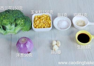 发布时间: 7小时前步骤1食材:西兰花150克、玉米粒150克、洋葱50克、大蒜3瓣 。调料:生抽3克、盐1克、鸡精1克 。步骤2西兰花洗净切小块 。步骤3洋葱切小块 。步骤4蒜切末 。步骤5锅中放入适量清水大火烧开,放入西兰花焯水1分钟,捞出备用 。步骤6锅...