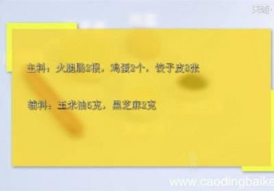 步骤1所需食材:火腿肠2根鸡蛋2个,饺子皮8张、玉米油5克,黑芝麻2克 。步骤2火腿肠切成小段备用 。步骤3将饺子皮刷上一层薄薄的油,再往上叠放一张饺子皮,一共叠放三张,用刀切成三份 。步骤4每一组饺子皮分成三份,每一份分别擀成细长三角形...