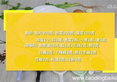 步骤1食材:鱼片400克,包菜300克,酸菜100克,鸡蛋1个,蒜3瓣,香菜2根,小葱1根,姜3克 。调味料:食用油10克,盐1克,生抽2克,醋3克,白糖3克,干辣椒3克,熟白芝麻3克,花椒2克,料酒2克,淀粉4克 。步骤2鱼片中加入料酒、...