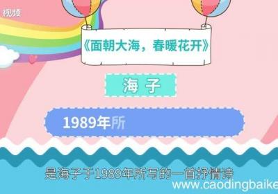 《面朝大海,春暖花开》是海子于1989年所写的一首抒情诗 。该诗以朴素明朗而又隽永清新的语言,唱出一个诗人的真诚善良 。全诗共三节,第一节表现了诗人对质朴、单纯而自由的人生境界的向往,对“永恒”、未知世界的探寻精神;第二节写诗人找到幸福后无...