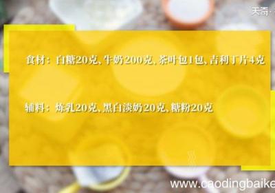 发布时间: 11小时前步骤1食材:白糖20克、牛奶200克、茶叶包1包、吉利丁片4克 。辅料:炼乳20克、黑白淡奶20克、糖粉20克 。步骤2奶锅中倒入纯牛奶、炼乳,放入糖粉 。步骤3小火煮至牛奶微沸 。步骤4关火加入吉利丁片 。步骤5搅拌均匀后过滤到大碗中 。...