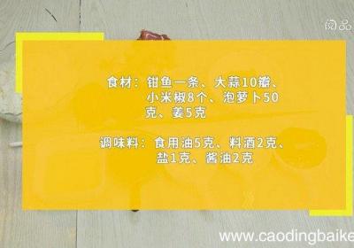 发布时间: 16小时前步骤1食材:钳鱼一条、大蒜10瓣、小米椒8个、泡萝卜50克、姜5克、食用油5克、料酒2克、盐1克、酱油2克 。步骤2钳鱼表面切竖条口 。步骤3加入料酒、盐抹匀,腌制10分钟 。步骤4大蒜切末 。步骤5小米椒剁碎 。步骤6泡萝卜切小丁 。步骤...