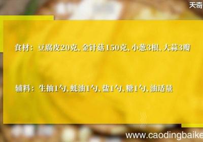 发布时间: 14小时前步骤1所需食材:豆腐皮20克、金针菇30克、小葱3根、大蒜3瓣 。步骤2大蒜切末 。步骤3豆腐皮用温水泡软 。步骤4切成长条 。步骤5金针菇洗净切去根部 。步骤6金针菇放在豆皮上,卷起来,用葱叶系紧 。步骤7热锅下油 。步骤8放入蒜末炒香...