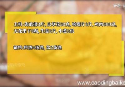 发布时间: 12小时前步骤1食材:海底椰3片,虫草花50克,响螺片3片,鸡肉500克,无花果干3颗,生姜2片,小葱3根、料酒4汤匙,盐2茶匙 。步骤2碗里倒入清水,放入无花果,海底椰,清洗干净,捞出沥干 。【虫草花海底椰响螺鸡怎么做 虫草花海底椰响螺鸡的做法】步...