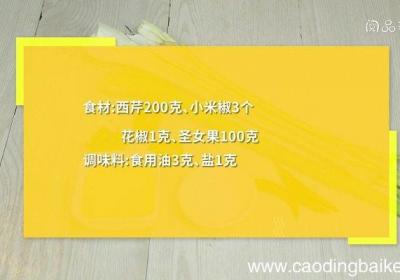 【芹菜拌凉菜的做法 芹菜拌凉菜怎么做】步骤1食材:西芹200克、小米椒3个、花椒1克 。调味料:食用油3克、盐1克 。步骤2西芹切小段 。步骤3小米椒切小圈 。步骤4西蓝花掰成小朵,放入沸水锅中焯烫1分钟,捞出备用 。步骤5锅中放水煮沸,放...