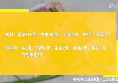发布时间: 11小时前步骤1准备食材:青菜150克、肉末200克、小葱1根、姜3克、鸡蛋1个、盐1克、鸡精1克、生抽2克、耗油1克、香油1克、白胡椒粉1克 。步骤2锅中放水煮沸,放入青菜焯水30秒,捞出,过凉水,沥干水分,剁成碎末 。步骤3小葱切末 。步骤4姜切...
