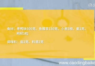发布时间: 15小时前步骤1准备食材:老鸭块500克,鱼腥草150克,小葱5根,姜2克,枸杞5粒,盐2克,料酒2克 。步骤2鸭肉洗净备用 。步骤3姜切片 。步骤4枸杞洗净 。步骤51根小葱切葱花 。步骤6鱼腥草洗净去须 。步骤7锅中加入1升清水,放入鸭肉、料酒2...
