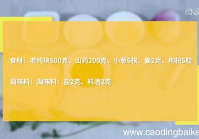 发布时间: 15小时前步骤1准备食材:老鸭块500克,山药200克,小葱5根,姜2克,枸杞5粒,盐2克,料酒2克 。步骤2鸭肉洗净备用 。步骤3姜切片 。步骤4枸杞洗净 。步骤51根小葱切葱花 。步骤6山药去皮切滚刀块 。步骤7锅中加入1升清水,放入鸭肉、料酒2...