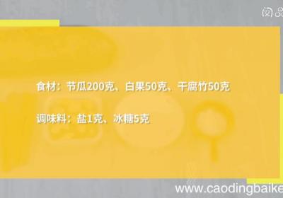 发布时间: 14小时前步骤1准备食材:节瓜200克,白果50克,干腐竹50克、盐1克,冰糖5克 。步骤2节瓜去皮,切条 。步骤3干腐竹掰小块,白果洗净 。步骤4锅中加700毫升清水、白果煮10分钟,放腐竹、冰糖,煮10分钟步骤5加入节瓜、盐,煮5分钟即可 。【腐...
