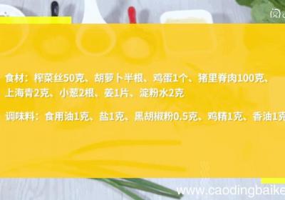 发布时间: 13小时前步骤1准备食材:榨菜丝50克、胡萝卜半根、鸡蛋1个、猪里脊肉100克、上海青2克、小葱2根、姜1片、淀粉水2克、食用油1克、盐1克、黑胡椒粉0.5克、鸡精1克、香油1克 。【榨菜肉丝汤做法榨菜肉丝汤怎么做】步骤2猪里脊肉切丝 。步骤3胡萝卜...