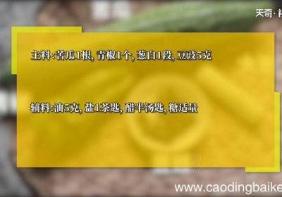 步骤1所需食材:苦瓜1根,青椒1个,葱白1段,豆豉5克、油5克,盐1茶匙,醋半汤匙,糖适量 。步骤2苦瓜对半切开,去囊,切薄片 。步骤3大葱斜切片 。步骤4豆豉切碎 。步骤5锅中热水,倒入苦瓜焯水至熟 。步骤6炒锅热油倒入豆豉,下大葱,苦瓜...
