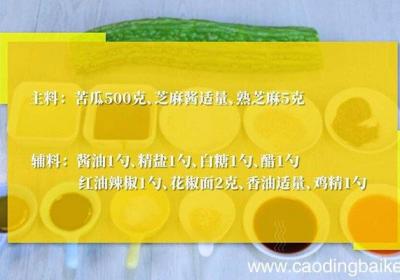 发布时间: 13小时前步骤1准备食材:苦瓜500g、食用油适量、芝麻酱适量、酱油1勺、精盐1勺、白糖1勺、醋1勺、红油辣椒1勺、花椒面2克、香油适量、鸡精1勺、熟芝麻5克 。步骤2芝麻酱放入碗中,加入酱油、精盐半勺、白糖、醋调匀 。步骤3再加入红油辣椒、花椒面、...