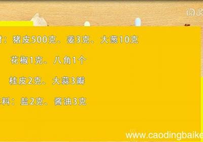发布时间: 1天前步骤1食材:猪皮500克、姜3克、大葱10克、大蒜3瓣 。调味料:盐2克、酱油2克 。步骤2猪皮放入冷水锅中,水沸后煮5分钟,捞出放凉,刮净油脂,洗净,切细条 。步骤3姜切片 。步骤4大葱切段 。步骤5大蒜切末 。步骤6小碗中放入蒜、酱油,...