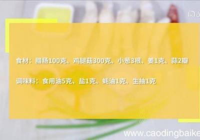 发布时间: 13小时前步骤1食材:腊肠100克、鸡腿菇300克、小葱3根、姜1克、蒜2瓣调味料:食用油5克、盐1克、蚝油1克、生抽1克步骤2腊肠切薄片 。步骤3鸡腿菇切薄片 。步骤4小葱切段 。步骤5姜切末 。步骤6蒜切末 。步骤7热锅倒油、油温5成热时、放腊肠...