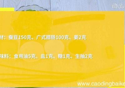 发布时间: 13小时前步骤1食材:蚕豆150克、广式腊肠100克、小葱2根、姜2克 。调味料:食用油5克、盐1克、糖1克、生抽2克 。步骤2蚕豆剥壳,取蚕豆米,锅中水沸后,下蚕豆米,煮10分钟,捞出 。步骤3姜切末 。步骤4广式腊肠切片 。步骤5热锅倒油,油温5...