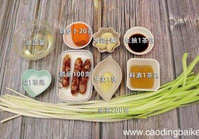 发布时间: 12小时前步骤1准备食材:韭黄200克、腊肠100克、油适量、盐1茶匙、胡萝卜20克、生姜1块、大蒜3瓣、料酒1茶匙、生抽1茶匙 。步骤2韭黄洗净切段 。步骤3腊肠切斜片 。步骤4胡萝卜切片 。步骤5生姜切片 。步骤6大蒜切片 。【韭黄炒腊肠的做法...