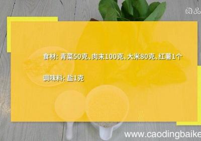 发布时间: 9小时前步骤1食材:青菜50克、肉末100克、大米80克、红薯1个 。调味料:盐1克 。步骤2青菜切碎 。【青菜瘦肉红薯粥的做法 青菜瘦肉红薯粥怎么做】步骤3红薯去皮,切小块 。步骤4锅中放入适量清水,放入大米、红薯煮沸后转小火煮30分钟 。步骤5...